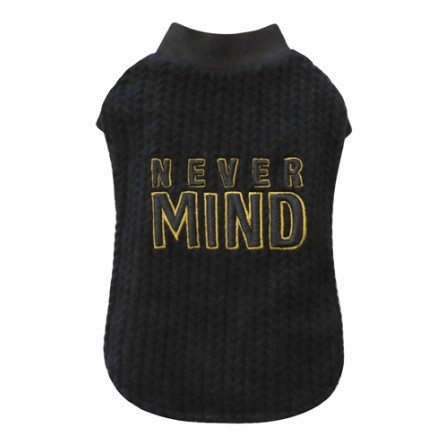 De Croci Hondentrui Nevermind Zwart van 45 cm is een stoere hondentrui van zachte fleecewol, met gouden ingenaaide print, kraagje en mouwtjes. Heerlijk voor binnenshuis en droge, minder koude dagen thuis! Deze trui heeft een klassiek doch stoere uitstraling met zijn banen geweven fleecewol. De gouden ingenaaide print met de tekst 'nevermind' geeft hem toch weer even een hedendaags tintje. De trui is voorzien van een kraagje en mouwtjes en heeft een fijne pasvorm door de banden bij de achterpoten en het elastisch buikdeel. Te gebruiken met halsband en looplijn.