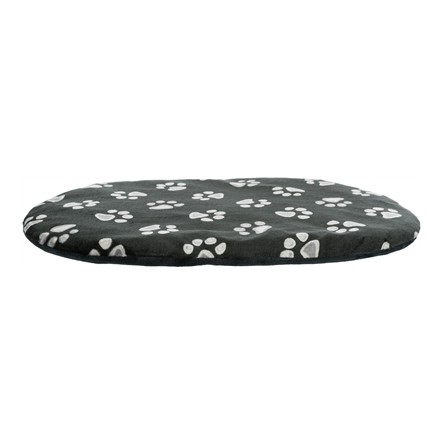 Het Trixie Kussen Jimmy Ovaal Zwart Met Pootprint 115 x 72 cm is een plat hondenkussen van zacht pluche met polyestervlies vulling, ideaal om als ligmat of in kunststof hondenmanden te gebruiken. Door de geringe dikte is dit kussen voor vele toepassingen te gebruiken. Kussen Jimmy is zeer geschikt om als opzichzelfstaande ligmat te dienen, maar ook ideaal om te gebruiken voor wat extra comfort in kunststof hondenmanden, zoals de Sleeper hondenmand. Het kussen is bekleed met polyester en heerlijk zacht pluche en eenvoudig af te nemen. Het kussen is wasbaar, de voering met de hand, de bekleding op 40 graden in de wasmachine.