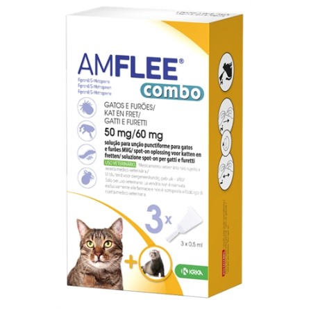 Amflee Combo Spot On Kat 50 mg in 3 pipetten zijn vlooiendruppels op basis van fipronil en s-Methopreen, die jouw kat, fret én de omgeving beschermen tegen vlooien, teken en luizen. Met deze handige spot on-pipetten is jouw dier eenvoudig beschermd tegen ongedierte! Amflee beschermt de kat gedurende twee weken tegen teken en gedurende vier weken tegen vlooien. Ook is het middel werkzaam tegen eitjes en larven in de omgeving en kan het worden toegediend bij een besmetting met bijtende luizen. Bij fretten is het middel gedurende vier weken werkzaam tegen vlooien en teken. Het pipet is gebruiksvriendelijk en hersluitbaar, waardoor jij heel gemakkelijk een vlooienplaag kan voorkomen of onder controle kan krijgen bij jouw dier! Amflee Combo Spot On is geschikt voor kittens ouder dan acht weken en/of zwaarder dan 1 kg en bij fretten ouder dan zes maanden.