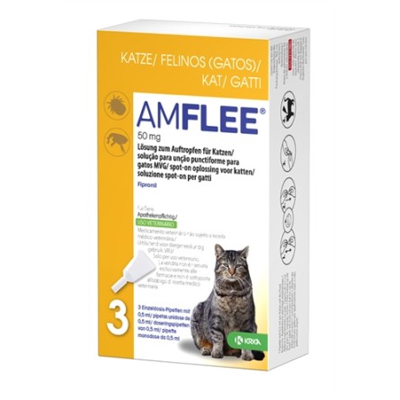 Amflee Spot On Kat in 3 pipetten zijn vlooiendruppels op basis van fipronil, die jouw kat beschermen tegen vlooien, teken en luizen. Met deze handige spot on-pipetten is jouw dier eenvoudig beschermd tegen ongedierte! Amflee beschermt de kat gedurende twee weken tegen teken en gedurende vier weken tegen vlooien. Ook kan het worden toegediend bij een besmetting met bijtende luizen. Het pipet is gebruiksvriendelijk en hersluitbaar, waardoor jij heel gemakkelijk een vlooienplaag kan voorkomen of onder controle kan krijgen bij jouw kat! Amflee Combo Spot On is geschikt voor katten vanaf twee maanden en/of die meer wegen dan 1 kg.