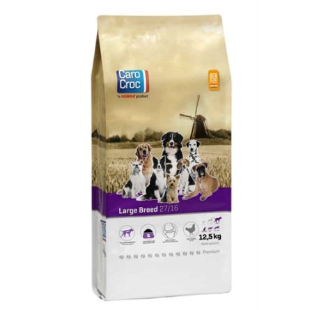 De CaroCroc Large Breed 12,5 kg is een volledige hondenvoeding voor grote honden met een hoger percentage eiwit. Grote hondenrassen zijn gevoeliger voor maagkanteling en gewrichtsslijtage dan kleine. CaroCroc Large Breed is wetenschappelijk onderbouwd en biedt grote honden de bescherming die zij nodig hebben. Zo kan deze voeding de kans op maagkanteling verminderen dankzij het geoptimaliseerde energiegehalte. Door het grotere brokformaat vermindert het schrokgedrag. Daarnaast kan het de botten en gewrichten ondersteunen dankzij toevoeging van gelatine hydrolysaat (stimuleert de vorming van collageen (bestanddeel bot en kraakbeen) en remt de afbraak van kraakbeen) en zalmolie.
