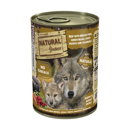 Natural Greatness Beef/Iberian Pork/Sweet Potato is compleet hondenvoer met twee hoogwaardige eiwitbronnen voor zowel pups als volwassen honden. Dit graanvrije voer is speciaal samengesteld met Iberisch varkensvlees en rundvlees, aangevuld met gezonde groenten en fruit zoals groene bonen, zoete aardappel en cranberry's.