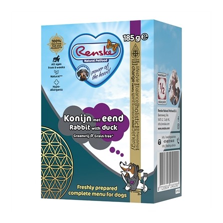 De Renske Vers Bereide Maaltijd Met Konijn En Eend Graanvrij natvoer van 24 x 185 gr is een volledige, smakelijke vers bereide vleesmaaltijd voor honden vanaf 9 weken, met 60% vers bereid vlees, rijst en groenten. Jouw hond geniet van dit natuurlijke, vers bereide natvoer van Renske! Deze vers bereide vleesmaaltijd bestaat voor maar liefst uit 60% uit kalkoen en eend, zónder vis en kip! Ook ideaal voor honden die gevoelig zijn voor bepaalde eiwitten dus. Het voer is aangevuld met rijst en heerlijke groenten van hoge kwaliteit, en nuttige toevoegingen zoals duindoorn, algen, yucca en xylo-oligosacchariden, een natuurlijke bron van prebiotica. Deze combinatie zorgt voor een fikse dosis antioxidanten, ondersteuning van het immuunsysteem en een gezonde spijsvetering. Door de hoogwaardige ingrediënten is de maaltijd licht verteerbaar en ook geschikt voor moeilijke eters. Hypoallergeen, glutenvrij en verpakt in kleinere porties. Perfect dus ook als alternatief voor rauwe voeding én onderweg!