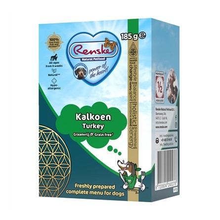 De Renske Vers Bereide Maaltijd Kalkoen Graanvrij natvoer van 24 x 185 gr is een volledige, smakelijke vers bereide vleesmaaltijd voor honden vanaf 9 weken, met 55% vers bereid vlees, rijst en groenten. Jouw hond geniet van dit natuurlijke, vers bereide natvoer van Renske! Deze vers bereide vleesmaaltijd bestaat voor maar liefst uit 55% uit kalkoen, zónder vis en kip! Ook ideaal voor honden die gevoelig zijn voor bepaalde eiwitten dus. Het voer is aangevuld met rijst en heerlijke groenten van hoge kwaliteit, en nuttige toevoegingen zoals duindoorn, cranberries, algen, yucca en xylo-oligosacchariden, een natuurlijke bron van prebiotica. Deze combinatie zorgt voor een fikse dosis antioxidanten, ondersteuning van het immuunsysteem en een gezonde spijsvetering. Door de hoogwaardige ingrediënten is de maaltijd licht verteerbaar en ook geschikt voor moeilijke eters. Hypoallergeen, glutenvrij en verpakt in kleinere porties. Perfect dus ook als alternatief voor rauwe voeding én onderweg!