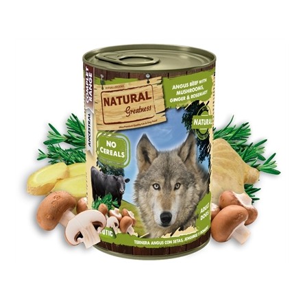 Natural Greatness Angus Beef / Mushrooms / Ginger / Rosemary is volledige natvoer voor de hond met een rijke smaak en een laag vetgehalte.
