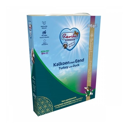 Renske Vers Kalkoen & eend is volledige diervoeding voor de hond. Het is een complete vers vlees voeding. Ook zeer geschikt voor honden die slecht reageren op droog- en of blikvoeding of andere soorten van vlees. Renske Natuurlijke Diervoeding is samengesteld uit een mix van de allerbeste natuurlijke ingrediënten uit de natuur. Het belangrijkste ingrediënt in dit product is kalkoen met eend, maar ook volkoren rijst en groenten zijn toegevoegd om de maaltijd compleet te maken. Renske Vers Vlees is verrijkt met schotse zalm olie (voor een glanzende vacht en een goede ontwikkeling van de hersenen) en glucosamine en chondrointine (ter ondersteuning van de gewrichten en kapsels). Tevens is ons product rijk aan natuurlijke anti-oxidanten ter bestrijding van de vrije radicalen in het lichaam van de hond.