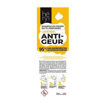 Héry Anti-geur Shampoo Poeder is een praktische en milieubewuste oplossing om je hond weer fris te laten ruiken. Dit poeder transformeert in een vloeibare shampoo wanneer je het mengt met heet water. De formule bevat 95% ingrediënten van natuurlijke oorsprong, waaronder lavendel, en heeft een antibacteriële en deodoriserende werking die lichaamsgeuren effectief neutraliseert. Één zakje is goed voor 250 ml shampoo en is geschikt voor honden van alle rassen.