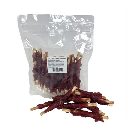Samenstelling: Eend (71,3%), collageen (22%), glycerol (3,5%), zetmeel (1,5%), pinda-eiwit (0,5%), erwten (0,5%), soja-eiwit (0,5%)