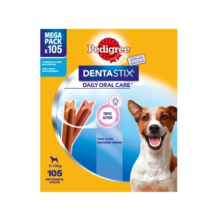 De Pedigree Dentastix Mini Multipack 105-pack zijn hondensnacks speciaal ontwikkeld voor de gebitsverzorging van kleine honden. Vier van de vijf honden ouder dan drie jaar hebben tandvleesproblemen, vaak veroorzaakt door de vorming van tandsteen en tandplak. Bij dagelijks gebruik kunnen Dentastix helpen deze problemen te verminderen. De unieke x-vorm reinigt moeilijk bereikbare tanden, vermindert tandsteen en bevordert gezond tandvlees. Dentastix van Pedigree is een effectieve en smakelijke manier om het gebit van je kleine, volwassen hond gezond te helpen houden.