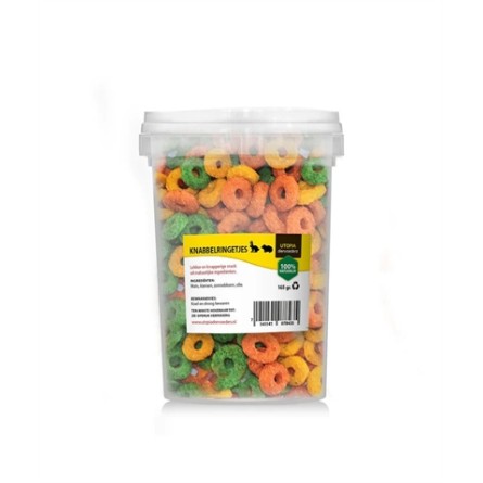 De Utopia Knabbel Ringetjes 165 gr zijn heerlijke, knapperige snacks op geheel plantaardige basis voor konijnen en knaagdieren. Verwen jouw konijn, cavia, hamster of gerbil met deze heerlijke snack! Deze lekkere ringetjes zijn heerlijk knapperig van structuur en samengesteld op basis van 100% natuurlijke ingrediënten, met maïs en zonnebloemolie. Door hun compacte formaat zijn ze ideaal om te geven als beloning of smakelijk tussendoortje.