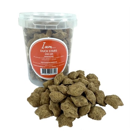 De I AM Duck Stars is een smakelijke hondensnack gemaakt van eend (40%). In de vorm van een sterretje, perfect als beloning of tussendoortje voor jouw viervoeter.