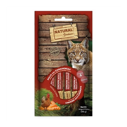 De Natural Greatness Creamy Chicken With Carrots Vision Support is een romige, hypoallergene kattensnack met de smaak van kip en wortel. Wortelen ondersteunen het immuunsysteem en een gezond oog- en hart- en vaatstelsel. Zonder granen.