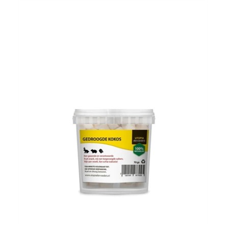 De Utopia Gedroogde Kokos van 80 gr is een smakelijke traktatie voor konijnen, knaagdieren en vogels, uit 100% gedroogde vrucht voor een gezonde en smaakvolle afwisseling. Konijnen, knaagdieren en vogels eten in de natuur een grote verscheidenheid aan verschillende soorten fruit. Hieruit halen zij broodnodige vitaminen, mineralen, antioxidanten en vezels die nodig zijn voor een goede imuunsysteem, een mooie vacht en gezonde darmwerking. Biedt jouw dier deze afwisseling nu heel eenvoudig met deze lekkere, verantwoorde snacks van Utopia! Deze stukjes fruit zijn gedroogd en komen in een handige hersluitbare verpakking, waardoor ze erg makkelijk in gebruik zijn. Rijk aan vitamine B en een echte traktatie!