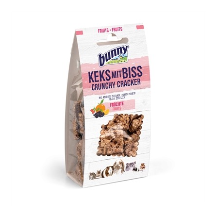 De Bunny Nature Crunchy Cracker Fruit 50 gr is aanvullend diervoeder voor konijnen en knaagdieren, een smakelijke, krokante snack voor konijnen, cavia's, chinchilla's en andere knaagdieren, verrijkt met inuline en rijk aan natuurlijke ingrediënten. Zo kan jij jouw kleine knager laten snacken zonder schuldgevoel! In tegenstelling tot de meeste snacks voorkomen de Bunny Crunchy Crackers een plotselinge stijging van bloedsuikerspiegel en de opbouw van vet. In plaats daarvan zijn deze lekkere snoepjes voorzien van inuline voor gezonde regulatie van de bloedsuikerspiegel en ondersteunen de crackers de darmwerking en spijsvertering. De lekkere koekjes zijn knapperig en krokant en zullen door deze structuur al gauw favoriet zijn bij jouw konijn, cavia, chinchilla, hamster, muis, gerbil of rat. Rijk aan natuurlijk ingrediënten als spelt, haverzemelen, rijst en diverse vruchten.