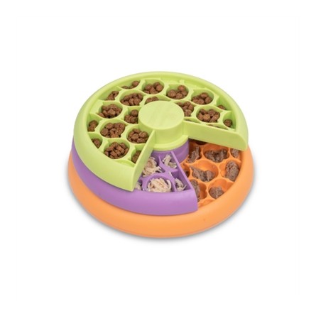 De Nina Ottoson Kitty Lickin'Layers Likmat 17 cm is een uitdagend intelligentiespel voor de kat, waarbij de kat de schijven moet verplaatsen om bij alle beloningen te komen. Plaats eenvoudig droogvoer, natvoer of snacks in de drie schijven. Jouw kat zal mentaal én lichamelijk uitgedaagd worden om het eten te vinden. De kat moet met de snuit en poten de schijven ronddraaien om zo al het eten te pakken te krijgen. Dit zorgt dat de kat actief moet nadenken over hoe zijn doel te bereiken en hij tevens lichamelijk bezig is. Het spel is schoon te maken door het eenvoudig uit elkaar te halen en de schijven met de hand af te wassen met een milde zeep en water.