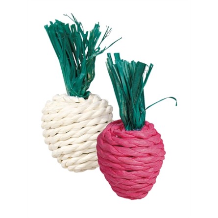 De Trixie Radijs En Rettich Met Stro 8 cm 2 st is natuurlijk speelgoed voor konijnen en knaagdieren, gemaakt van 100% natuurlijk stro. Hierdoor zijn de speeltjes veilig om aan te knagen en lekker licht van gewicht, zodat jouw dier en lekker mee kan gooien en spelen.