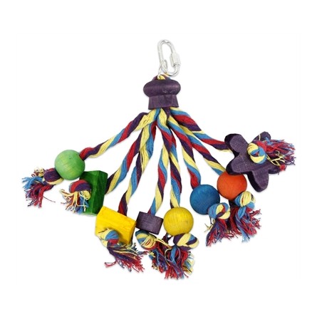 Dit speelgoed is een feestje voor jouw papegaai! De aantrekkelijke kleuren en het gebruik van verschillende materialen zoals hout en touw prikkelen jouw papegaai om op ontdekkingstocht te gaan. Ideaal om de snavel eens flink in te zetten, in te hangen en heen en weer te zwieren! Het hout en touw is van duurzame kwaliteit waar ze nog uren speelplezier van zullen ondervinden.