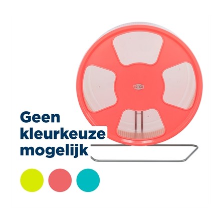 Het Trixie Looprad Kunststof Assorti 28 cm is een loopwiel van groot formaat voor muizen en dwerghamsters, voor minimale belasting van de wervelkolom en bewegen zonder geluidsoverlast. Veel dieren belasten de wervelkolom teveel tijdens het lopen in een loopwiel, omdat zij gebogen moeten lopen in een te klein wiel. Door het royale formaat van dit wiel is dat niet langer aan de order De wervelkolom wordt minimaal belast omdat het dier veel rechter kan lopen en het gesloten loopgedeelte zorgt voor veilig rennen. Het wiel is gemaakt van kunststof voor makkelijk reinigen en loopt soepel en fluisterstil, ideaal omdat muizen en hamsters nachtdieren zijn. Het wiel is met de houder rechtop in de kooi te zetten, maar ook aan de tralies te bevestigen.
