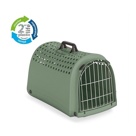Imac Reismand Linus 2nd Life Gerecycled Groen 50X32X34,5 cm is een moderne transportbox voor de hond of kat van sterk, gerecycled plastic, met veel ventilatie en ijzeren traliedeur.