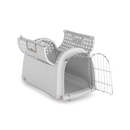 Imac Reismand Linus Cabrio Lichtgrijs 50X32X34,5 cm is een moderne transportbox voor de hond of kat van sterk plastic, met veel ventilatie en ijzeren traliedeur.