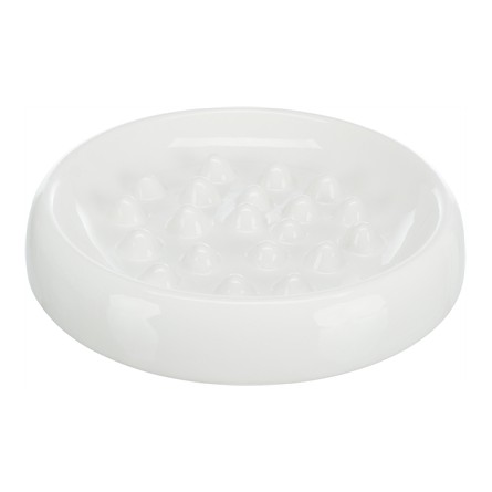 Schrokt jouw hond bij elke maaltijd zijn eten naar binnen? Heeft dit een nadelig effect op zijn darmwerking? Deze slowfeeder van Trixie is dan de oplossing. Deze keramieken voerbak is binnenin voorzien van noppen op de bodem, waar de hond omheen moet eten. Hierdoor kost het hem of haar meer moeite en tijd om het voer op te eten, wat de darmwerking van de hond ten goede komt! De voerbak is van stevig keramiek en glad afgewerkt, waardoor hij geschikt is voor alle soorten voer. Ook is de voerbak makkelijk te reinigen én vaatwasserbestendig.