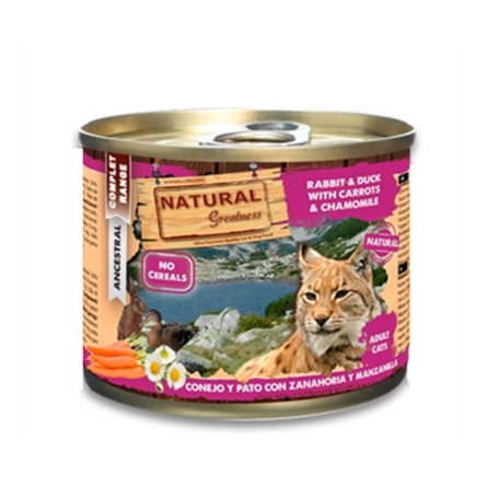 De Natural Greatness Rabbit/Duck With Carrots And Chamomile 185 gr kattenvoeding is volledig graanvrij natvoer voor de kat zonder kunstmatige toevoegingen met natuurlijke ingrediënten. Deze heerlijke kattenvoeding bevat een mix van hoogwaardige en gezonde vleessoorten uit eend en konijn. Daarnaast zal jouw kat smullen van de wortel en kamille in dit natvoer! Wortel zit boordevol vitamine A, C en K. Ook bevat het veel kalium en vezels. Zo kan het de huid en het zichtvermogen ondersteunen. Kamille heeft een rustgevend effect. Zo kan het krampstillend, gas verlichtend en kalmerend werken.