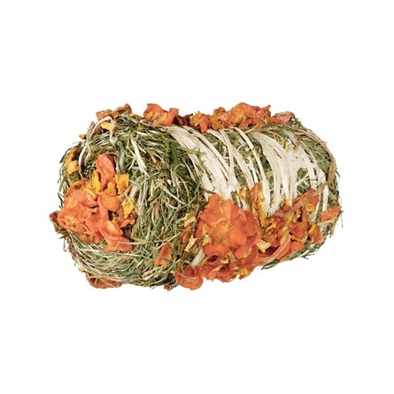 De Trixie Hooibaal Pompoen En Wortel 18 cm is een heerlijke, natuurlijke snack voor konijnen en knaagdieren uit ruwvoer, met hooi en lekkere pompoen en wortelstukjes omwikkeld met henneptouw. Helemaal graanvrij! Deze leuke hooirol is een gezonde snack voor jouw knaagdier die de tandverzorging ondersteunt en verveling tegengaat. Dit kleine hooibaaltje bestaat uit heerlijk vers hooi met pompoen en wortel en omwikkeld met henneptouw. Jouw dier kan naar hartenlust knagen aan deze lekkere baal, wat verveling tegengaat, een correcte darmwerking ondersteunt en helpt bij de correcte afslijting van de tanden. Een zeer gezonde, natuurlijke snack die graanvrij is en geen toegevoegde suikers bevat!