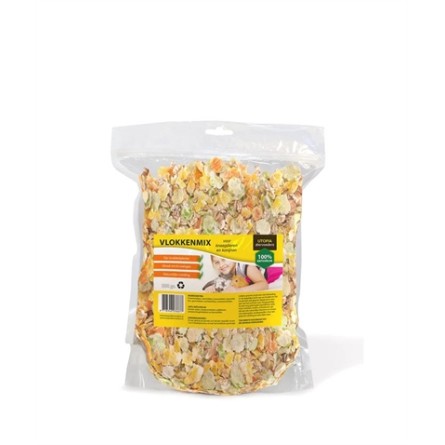 Deze Vlokkenmix in 550 gram is een lekker tussendoortje of aanvulling op het voer voor konijnen en knaagdieren op geheel natuurlijke basis. Dit lekkere mengsel bestaat uit mais, wortelen, erwten of tuinbonen in gedroogde vorm, die rijk zijn aan natuurlijke vitaminen en mineralen en belangrijke voedingsstoffen. Je kunt de Vlokkenmix zo als tussendoortje of beloning geven, maar ook mengen door het normale voer voor wat meer afwisseling.