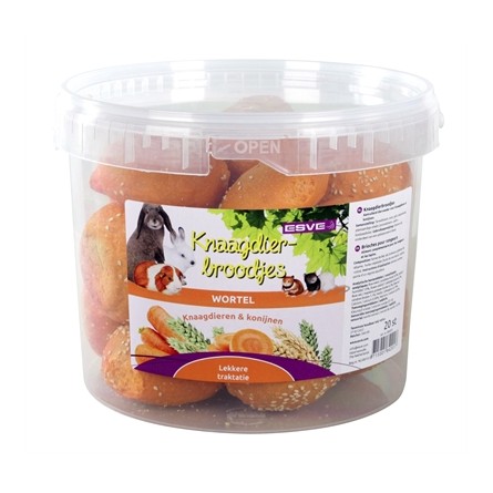 De Esve Wortelbroodjes 20 stuks zijn lekkere knaagsnacks voor jouw huisdieren. Deze lekkere broodjes met wortelsmaak zijn van groot formaat, zodat jouw dier lekker lang zoet is het het oppeuzelen van deze traktatie. Dit helpt bij het afslijten van het gebit en gaat verveling tegen, en helpt aan de natuurlijke knaagbehoefte van het dier te voldoen. Geschikt voor konijnen, cavia's, hamsters en andere kleine knaagdieren