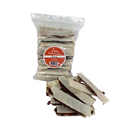 I Am Duck D'Light Rawhide is een stevige snack voor honden, gemaakt van eend en runderhuid. Deze eiwitrijke traktatie is geschikt als tussendoortje of beloning.