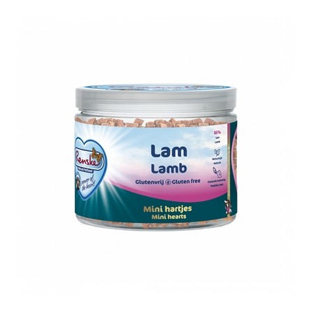 Renske Mini Hartjes Lam zijn graanvrije beloningssnacks in hartvorm, met konijn als enige eiwitbron. Deze snacks zijn geschikt als verantwoord tussendoortje of trainingssnoepje voor honden vanaf 9 weken.
