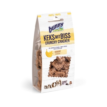 De Bunny Nature Crunchy Cracker Banaan 50 gr is aanvullend diervoeder voor konijnen en knaagdieren, een smakelijke, krokante snack voor konijnen, cavia's, chinchilla's en andere knaagdieren, verrijkt met inuline en rijk aan natuurlijke ingrediënten. Zo kan jij jouw kleine knager laten snacken zonder schuldgevoel! In tegenstelling tot de meeste snacks voorkomen de Bunny Crunchy Crackers een plotselinge stijging van bloedsuikerspiegel en de opbouw van vet. In plaats daarvan zijn deze lekkere snoepjes voorzien van inuline voor gezonde regulatie van de bloedsuikerspiegel en ondersteunen de crackers de darmwerking en spijsvertering. De lekkere koekjes zijn knapperig en krokant en zullen door deze structuur al gauw favoriet zijn bij jouw konijn, cavia, chinchilla, hamster, muis, gerbil of rat. Rijk aan natuurlijk ingrediënten als spelt, haverzemelen, rijst en diverse vruchten.