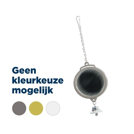 Leuk plastic spiegeltje in een ronde vorm met een belletje. Het speeltje is gemakkelijk te bevestigen aan de kooi door de ijzeren ketting met klipje aan het einde.