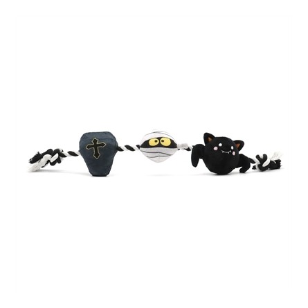 De Croci Fright RIP Flostouw Met Pluche Griezels 45,5 cm is een hondenknuffel die griezelig speelplezier naar je huis brengt. Dit speeltje is gemaakt van stevig flostouw, perfect om op te kauwen en mee te trekken. Aan het flostouw zitten drie griezelige figuurtjes van pluche. Daarnaast maakt het speeltje geluid, wat het speelplezier nog groter maakt voor je hond.