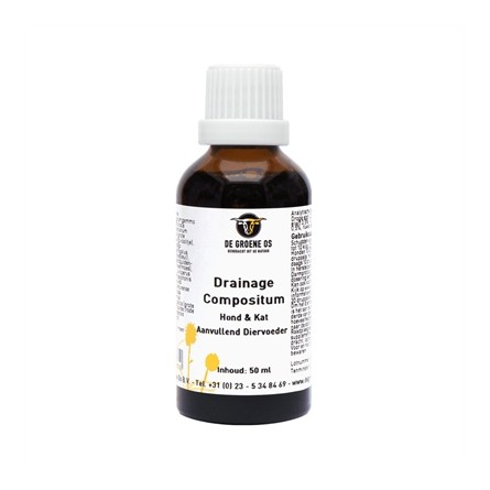 De Groene Os Drainage Compositum Hond/Kat 50 ml is een supplement met een brede reinigende werking en een positieve invloed op de stofwisseling, nieren en spijsvertering voor honden en katten. Perfect voor een zuiverende kuur. Drainage Compositum geeft een boost aan de reiniging van het lichaam door de lever te helpen bij het verwijderen van afvalstoffen en de positieve invloed op de nieren. Dit recept bevat ingrediënten die het immuun- en lymfesysteem activeren, de spijsvertering bevorderen en de stofwisseling stimuleren waardoor het opslaan van nieuwe afvalstoffen voorkomen wordt. Hierdoor helpt het bij een gevoelige huid, is het goed voor een gezonde spijsvertering en kan het toegepast worden als zuiverende kuur.
