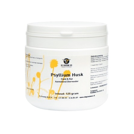De Groene Os Psyllium Husk Hond/Kat 125 gr is een supplement voor honden en katten en bestaat uit vezels voor een goede darmwerking voor een normale darmpassage en darm reinigende werking. Psyllium Husk bestaat uit vezels die tot twintig keer hun eigen gewicht aan water op kunnen nemen. Hierdoor wordt de darminhoud zachter en volumineuzer, waardoor de darmpassage gemakkelijker gaat. Het kan ook ingezet worden bij te dunne ontlasting, omdat het supplement het vocht in de ontlasting op kan nemen en zo de ontlasting dikker maakt. Daarnaast heeft het middel een milde darm reinigende werking en bevordert het de spijsvertering.