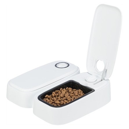 De Trixie Tx2 Automatische Voerdispenser in wit/zwart van 2x300 ml is een voerbak die zorgt voor voer en water tijdens je afwezigheid.